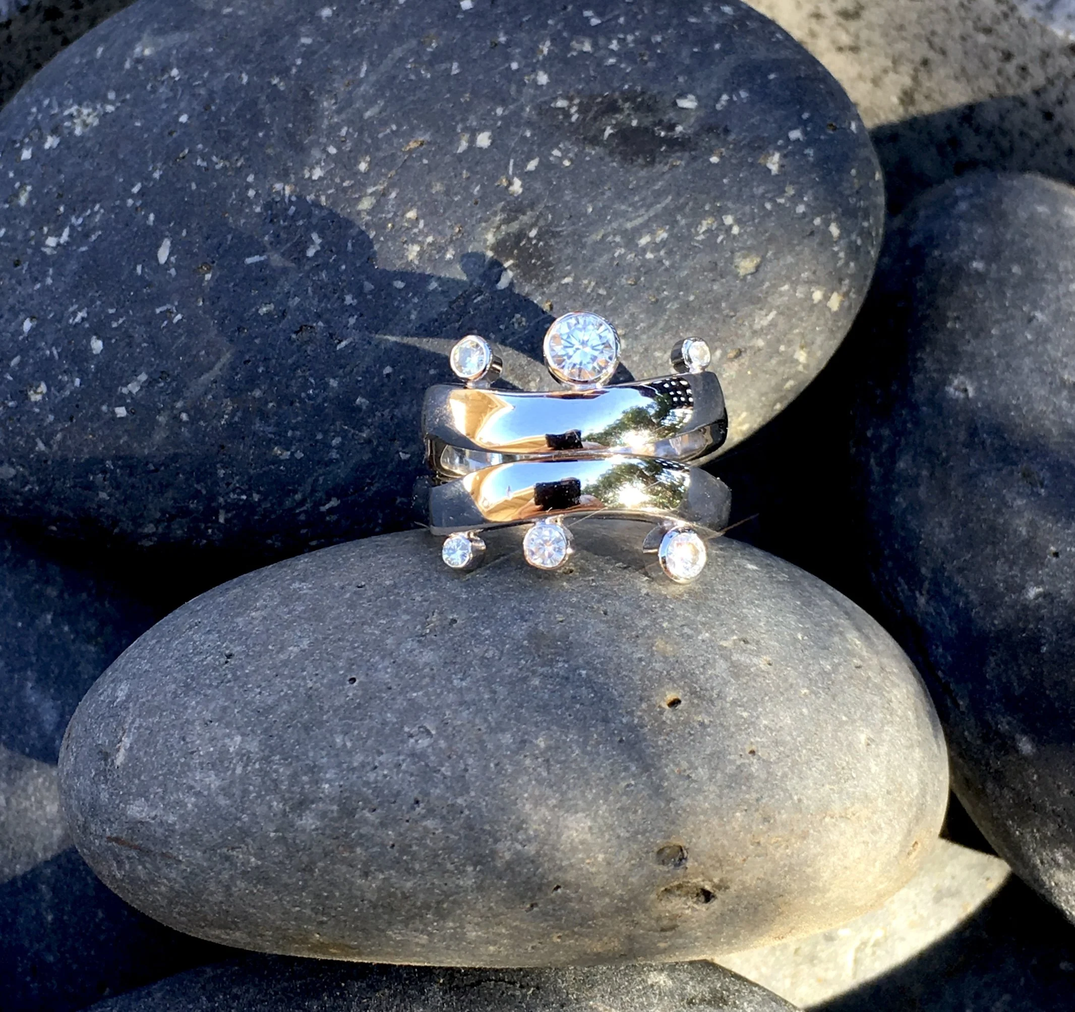 Each experience provides a dynamic combination as I develop my work with the fundamentals of three-dimensional construction. First, I design for the body’s contours, then I engineer overlapping components and apply finishes and gemstones to express “functional sculpture.” Blending and pushing the boundaries between fashion, art, architecture and traditional fine jewelry techniques, my pieces emphasize modern, minimalist shapes with intricate structures and colors.